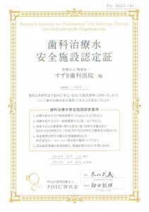 歯科治療水(歯科ユニット水やうがい水)の汚染問題がクローズアップされていますが、皆が安心安全な歯科治療を受けられるための施設基準を定め、十分な審査の上、「歯科治療水安全認定施設」として今年も認定されました。