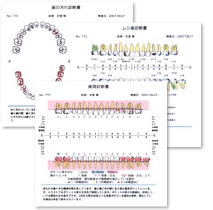 患者さんに、現在のお口の中を把握していただけるシステム「Dental X」を導入いたしました。口腔内の虫歯、プラークの付着状態、動揺度、充填物、かぶせ物の状態等の検査をした後、患者さんの診断説明書、虫歯診断書、歯の汚れ診断書、歯周診断書をまとめてプリントアウトしてお渡しできるソフトです。