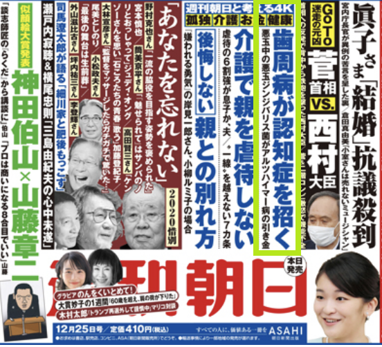 今回の週刊朝日の誌面にも「歯周病が認知症を招く」という記事がありました。