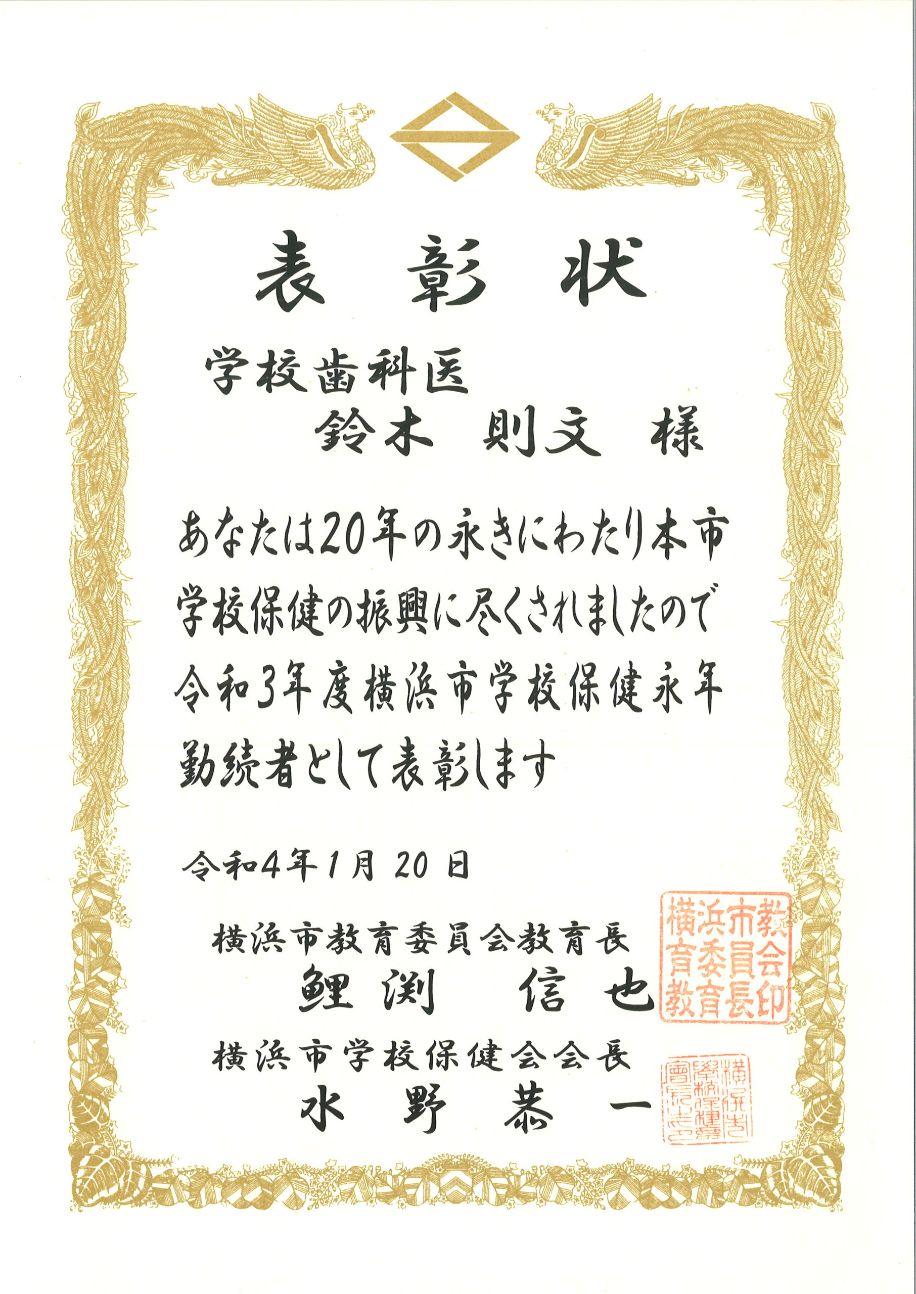 この度、大変ありがたいことに横浜市立西寺尾第二小学校の校医として20年間勤めましたことを横浜市教育委員会より永年勤続者として表彰して頂きました。