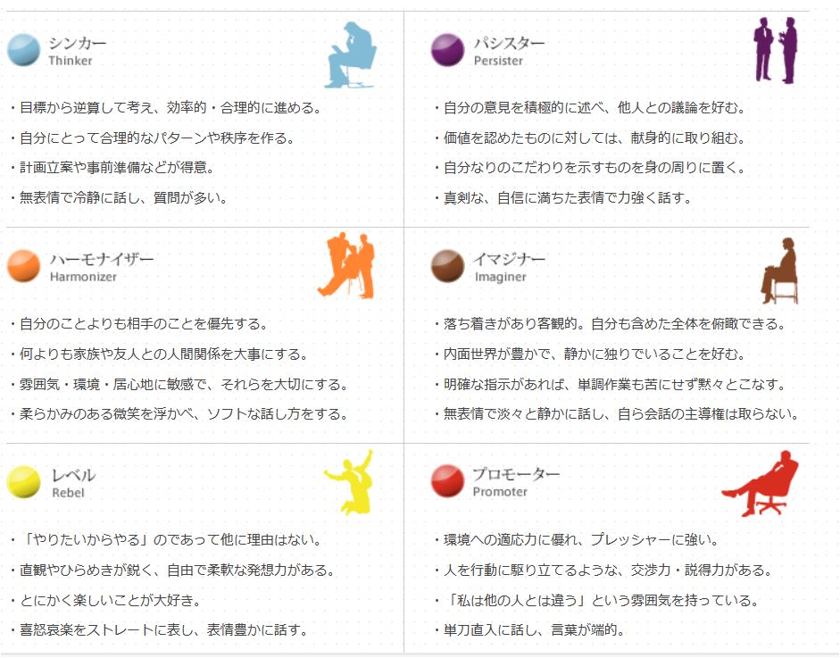 45問の質問に回答し、自分の性格を6つのパーソナリティタイプに分け、それぞれの特長を理解して自らのパーソナリティタイプの組み合わせやパターンを知ることによって、自分自身をより深く知り、受け入れられるようになるそうです。また、自分自身への理解が深まることによって、周りの人たちのことも理解できるようになり、コミュニケーションを円滑に自分を知り、相手を知ることでミスコミュニケーションを回避し、良好なコミュニケーション、人間関係を構築していくことができるようになるとのことです。